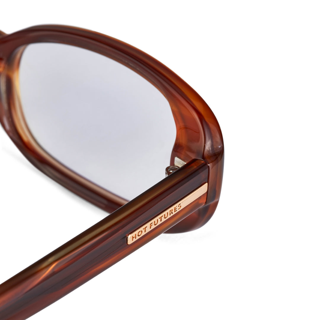 Eco caramel acetate frame. Integrated alloy hinges. Frame width (edge to edge): 140mm // Temple Length: 140mm // Lens width: 50mm // Lens height: 28mm.