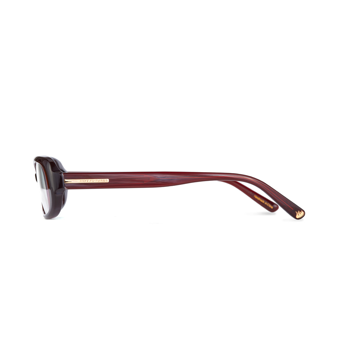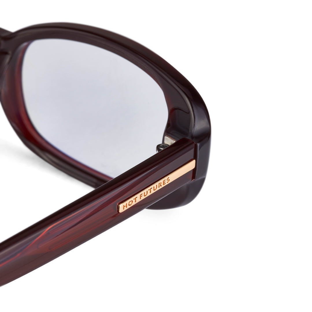 Eco cherry red acetate frame. Integrated alloy hinges. Frame width (edge to edge): 140mm // Temple Length: 140mm // Lens width: 50mm // Lens height: 28mm.