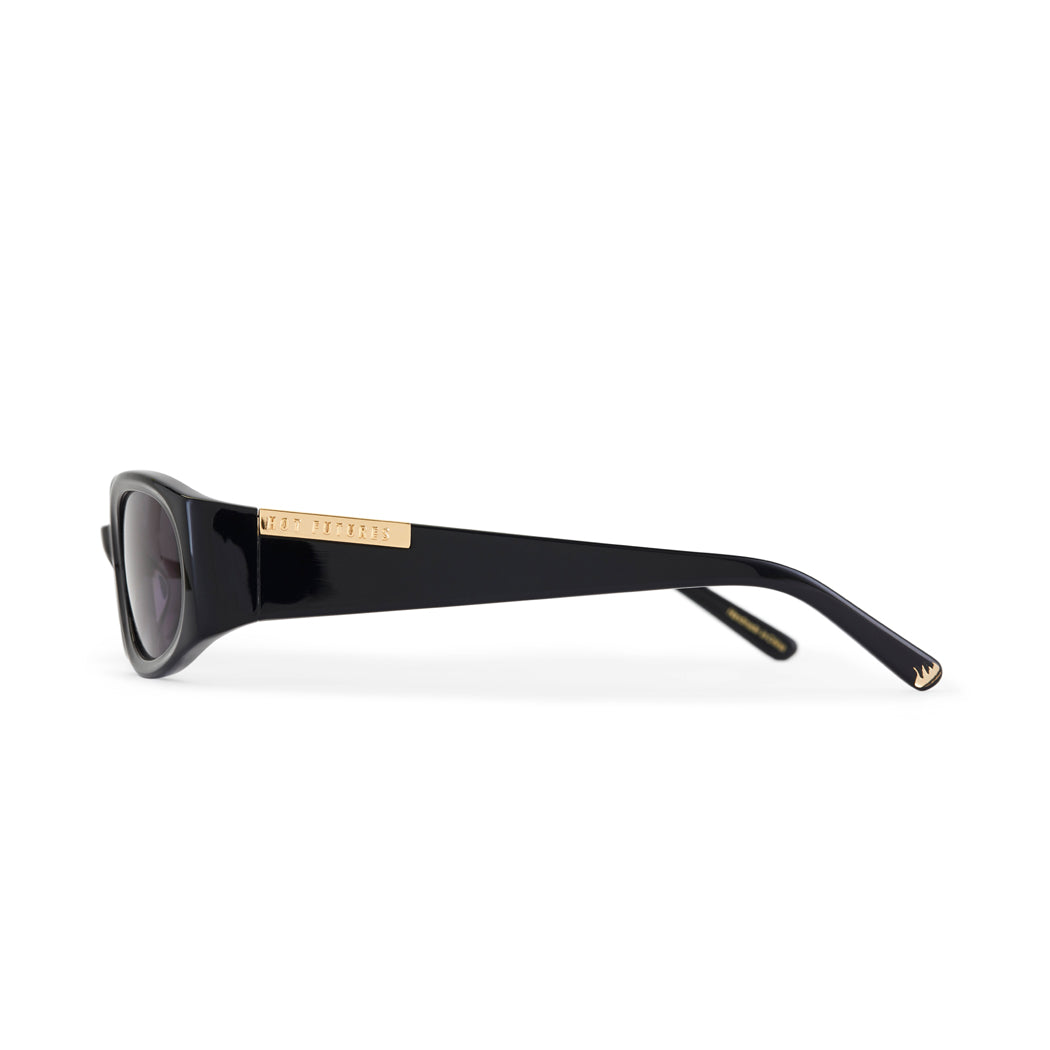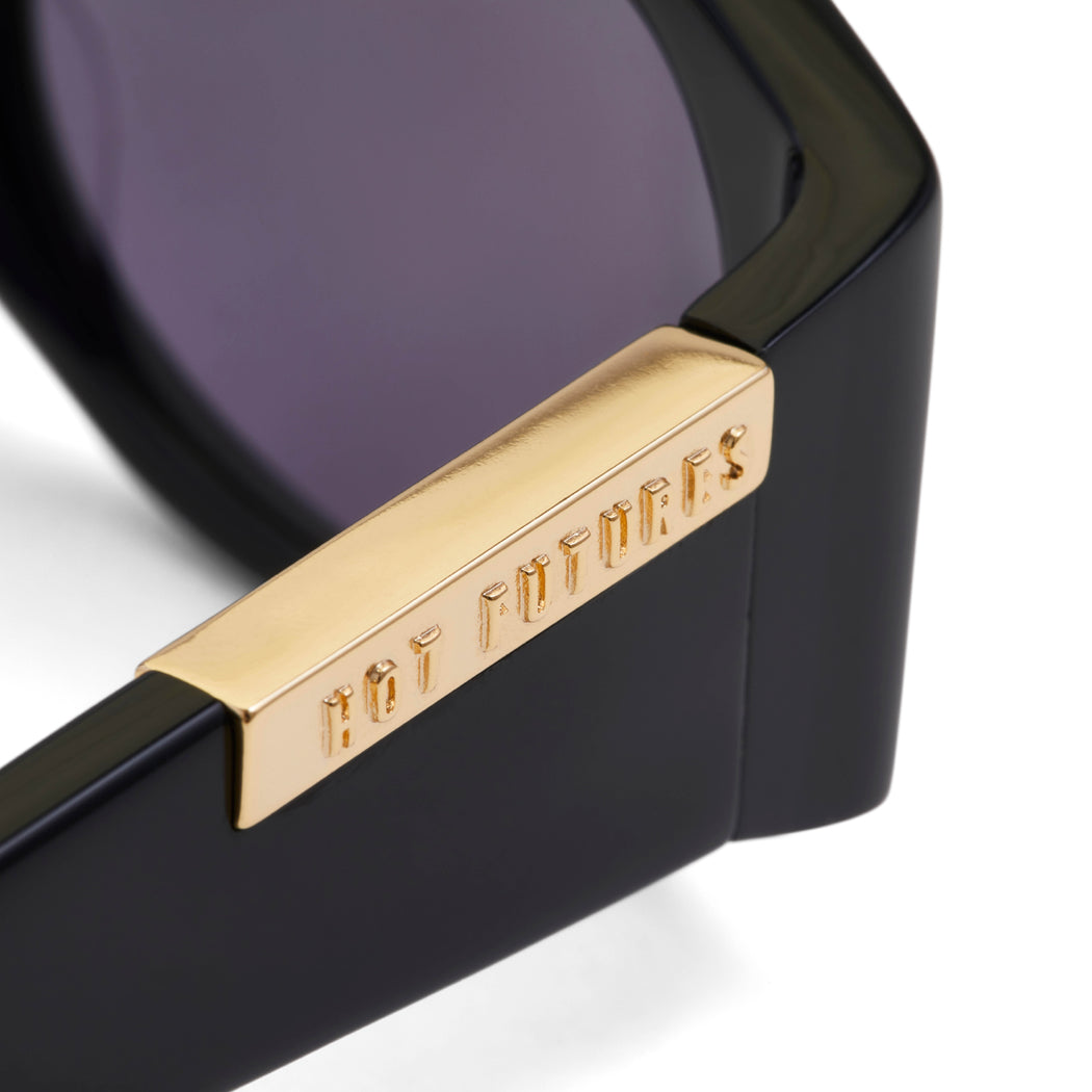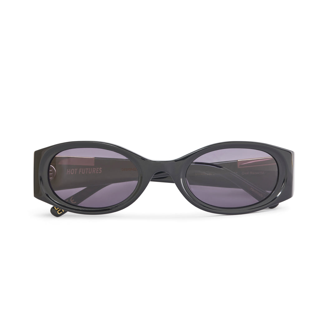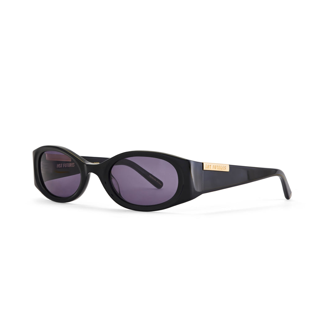 Slim oval racer with wrapped front to temple dimension and bevelled inset lenses. Completed with top side clip Hot Futures logo block and signature gold foil frame detailing.
