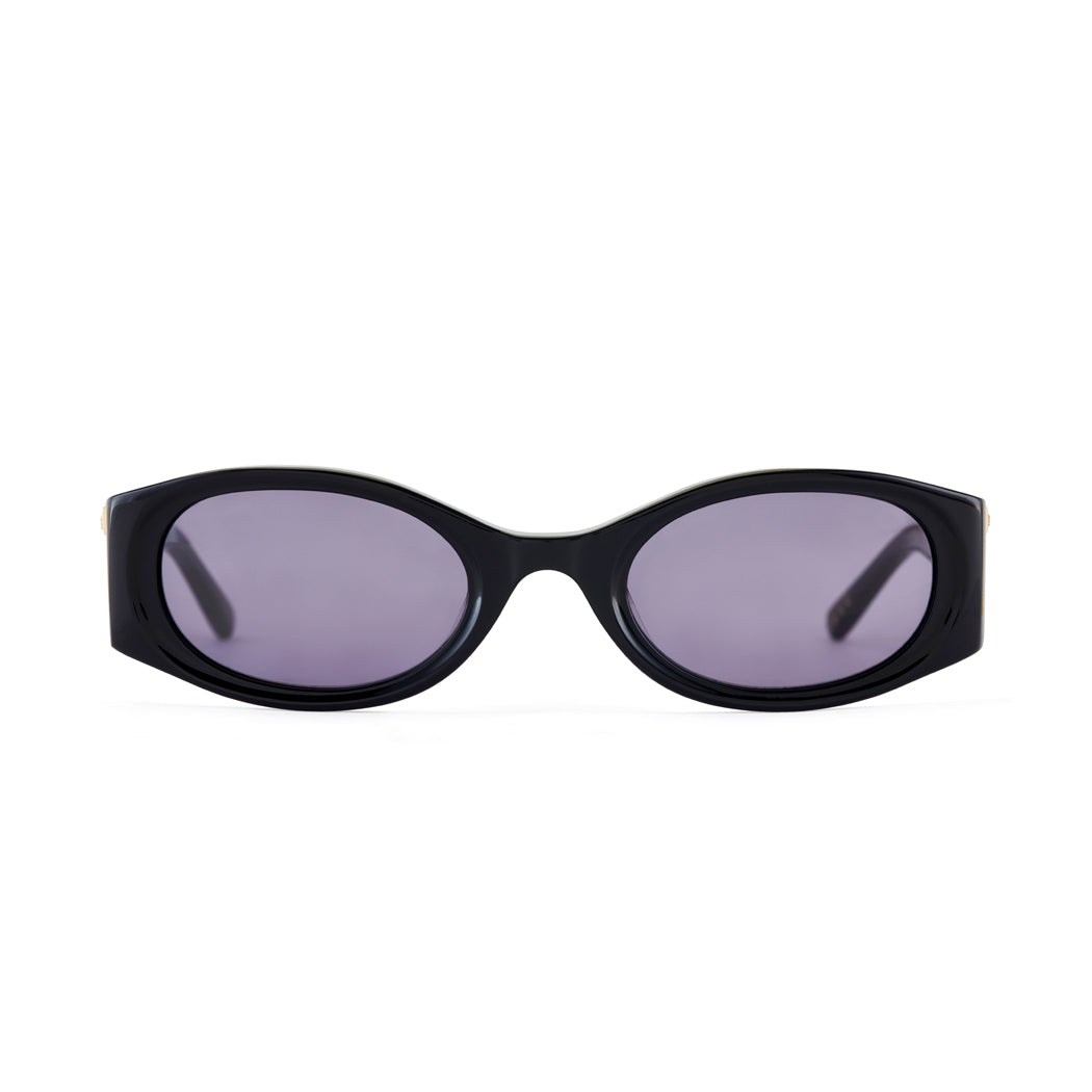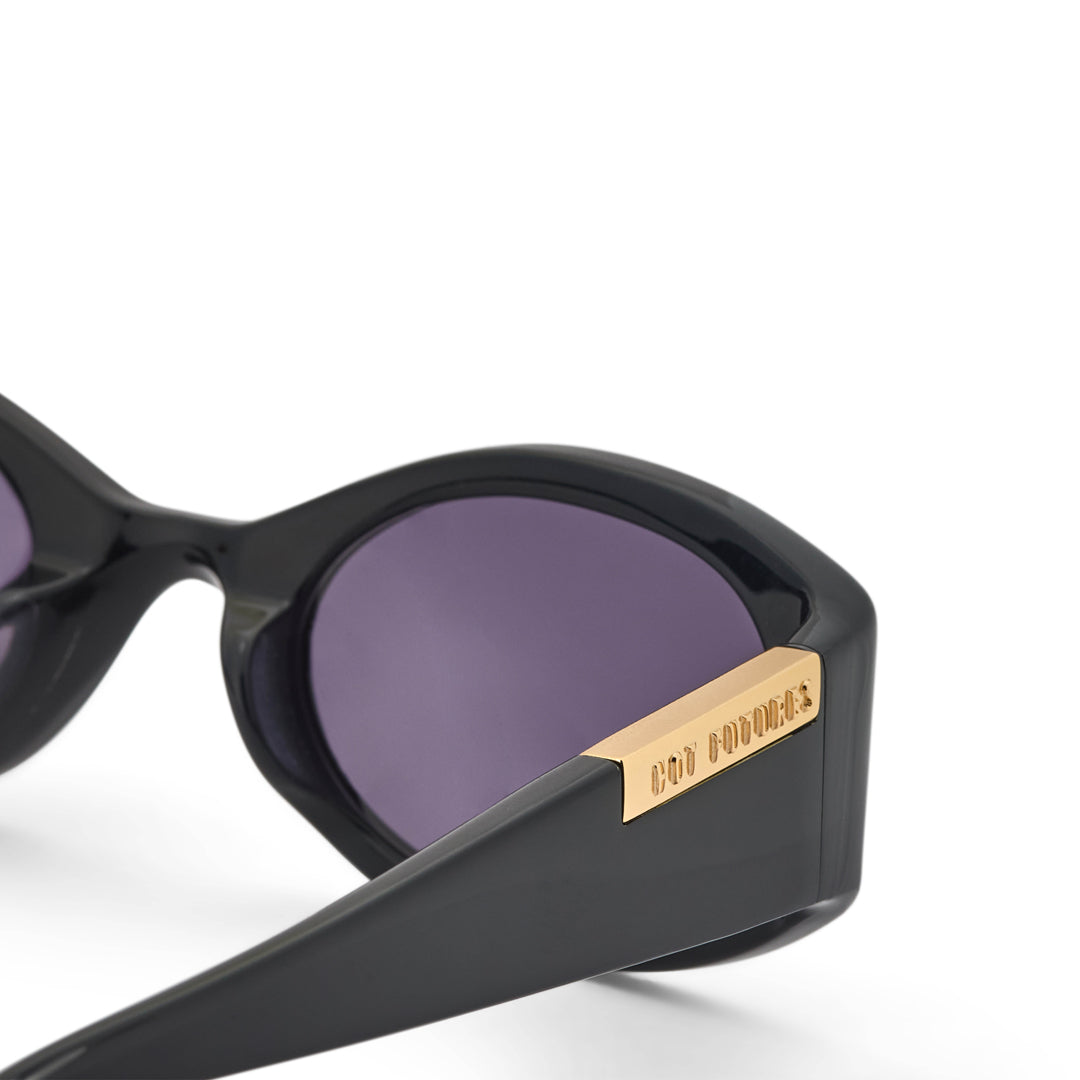 Recycled gloss black acetate frame (Global Recycled Standard). Smoke tinted 100% UVA/UVB protected CR39 Category 3 lenses. Three barrel alloy hinges. Frame width (edge to edge): 142mm // Temple Length: 135mm // Lens. width: 49mm // Lens height: 31mm.