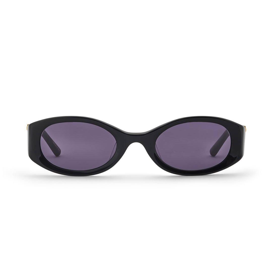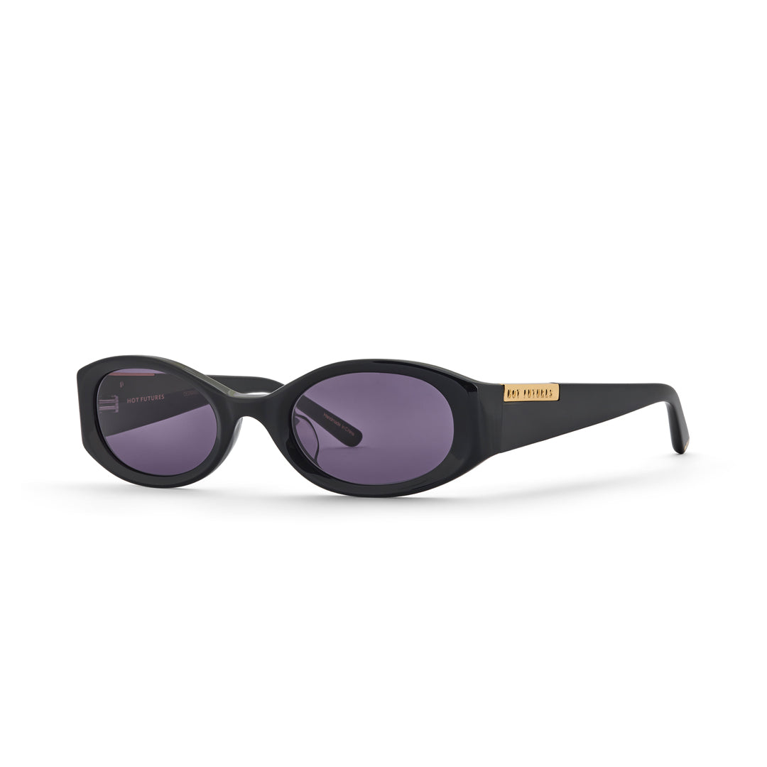 Slim oval racer with wrapped front to temple dimension and curved liquid edges. Completed with top side clip Hot Futures logo block and signature gold foil frame detailing.