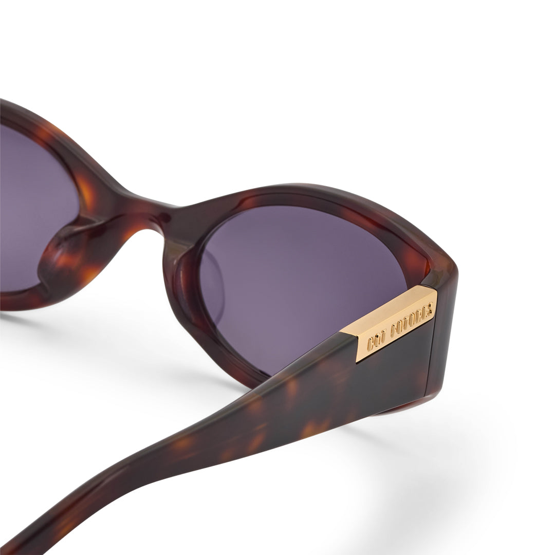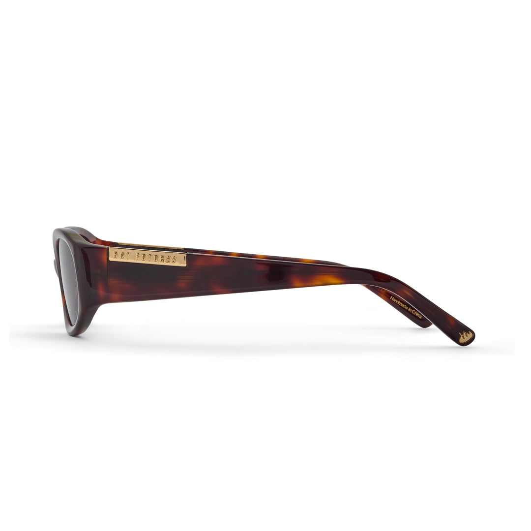 ECO tortoiseshell acetate frame. Smoke tinted 100% UVA/UVB protected CR39 Category 3 lenses. Three barrel alloy hinges. Frame width (edge to edge): 142mm // Temple Length: 135mm // Lens width: 49mm // Lens height: 31mm.