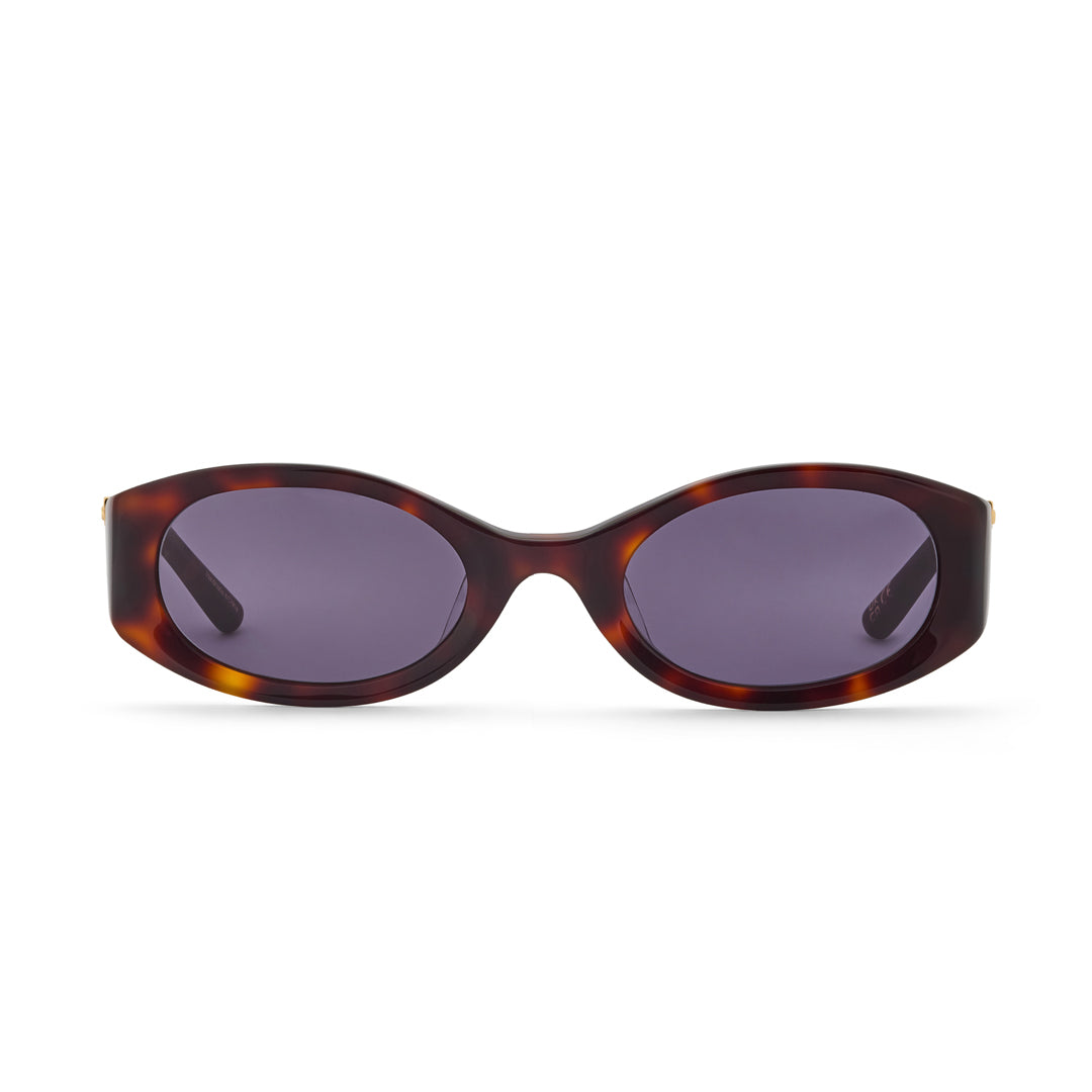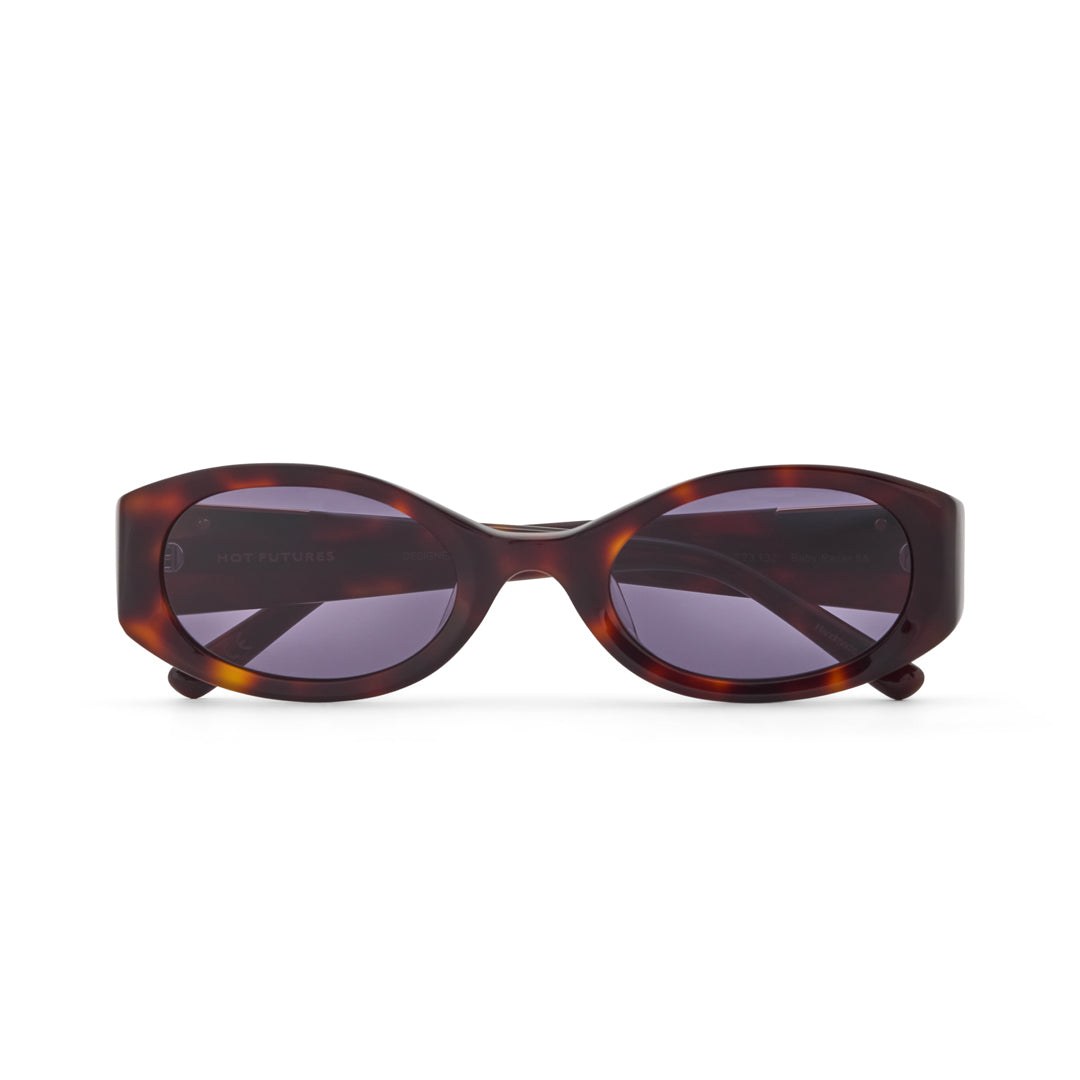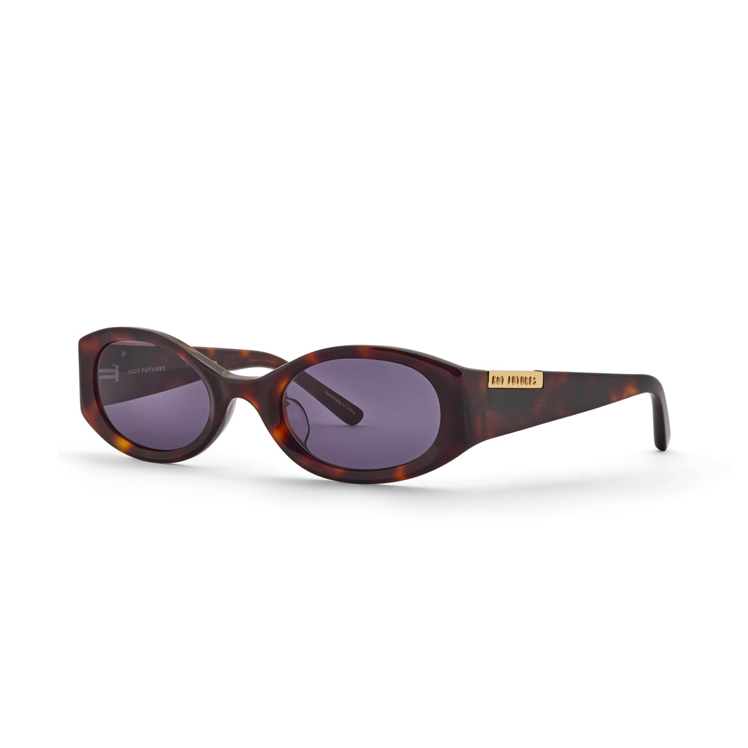 Slim oval racer with wrapped front to temple dimension and curved liquid edges. Completed with top side clip Hot Futures logo block and signature gold foil frame detailing.