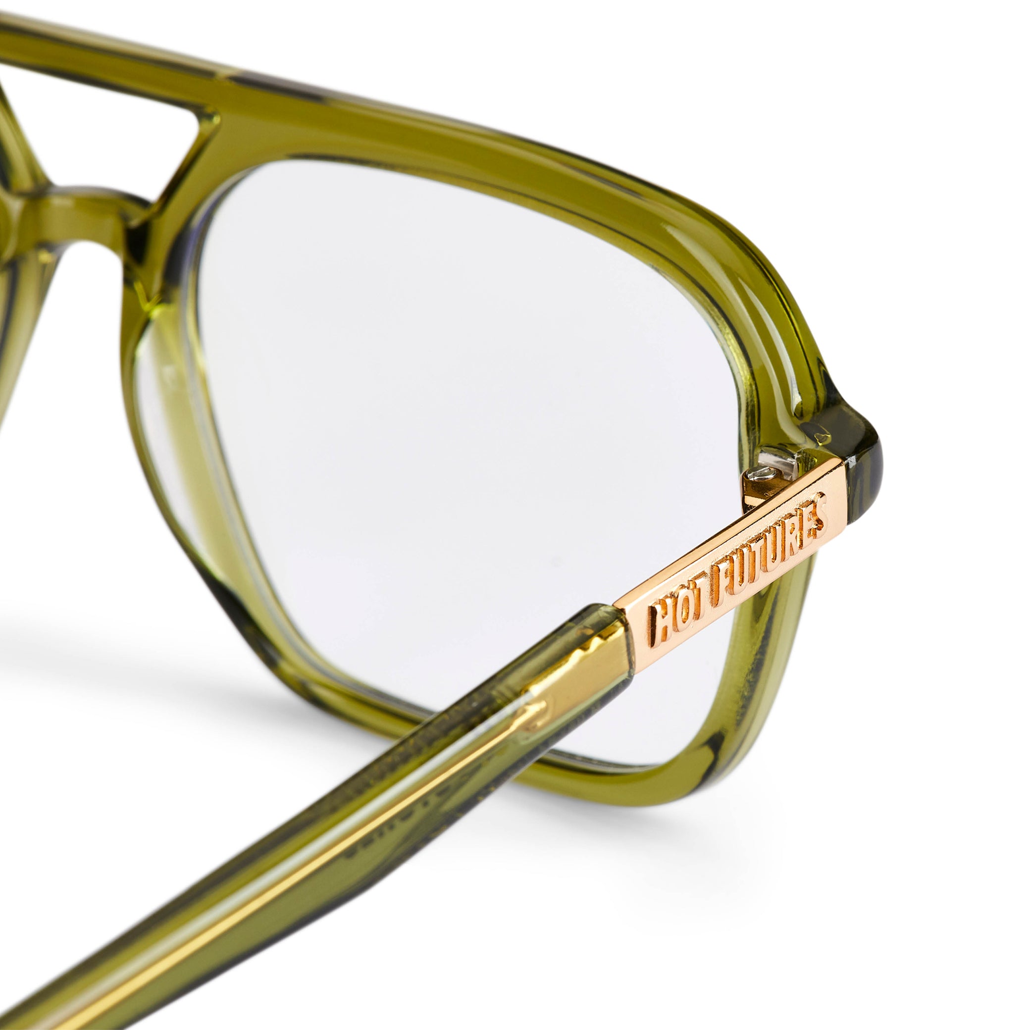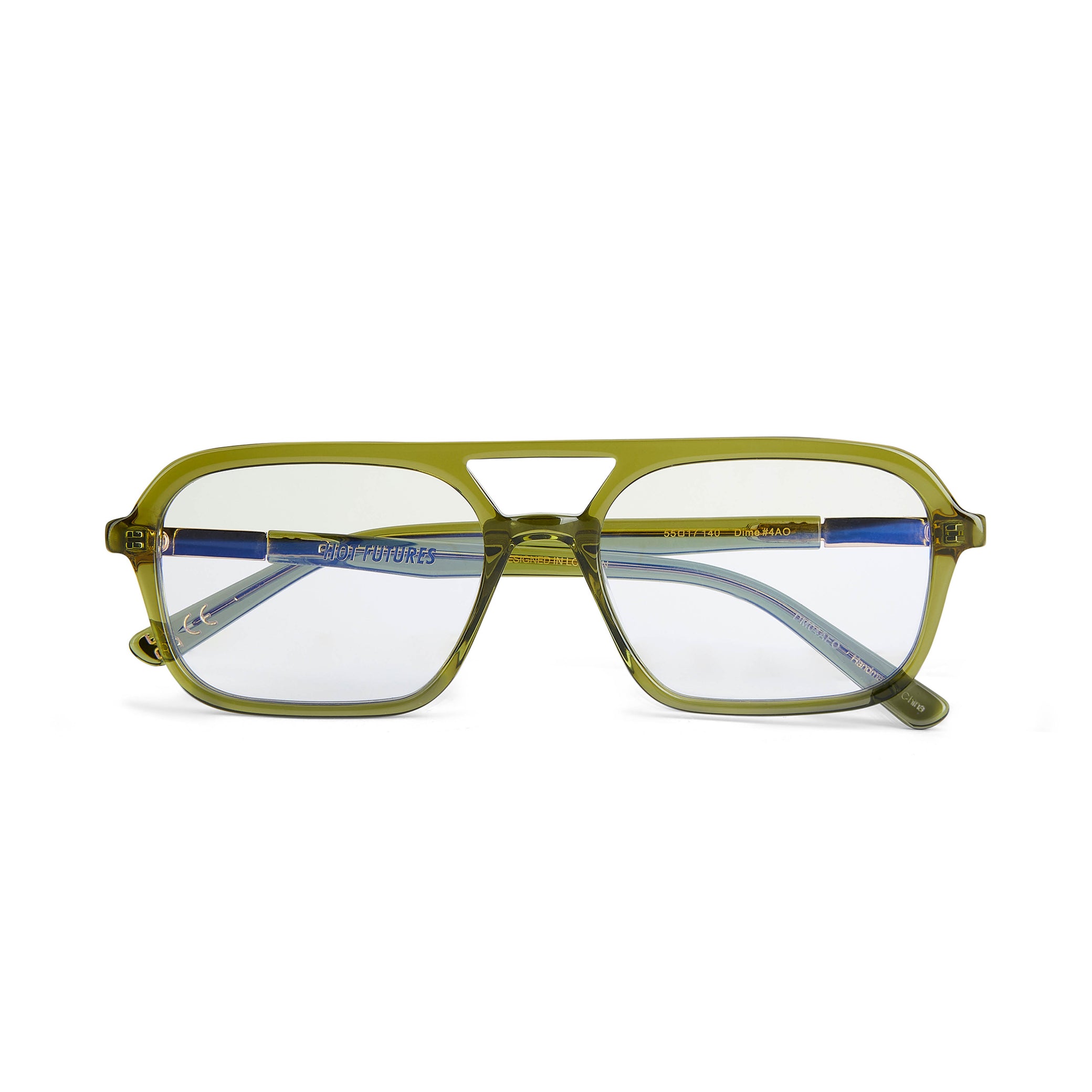 Eco Clear Green acetate frame. Three barrel alloy hinges. Frame width (edge to edge): 143mm // Temple Length: 140mm // Lens width: 53.5mm // Lens height: 39mm.