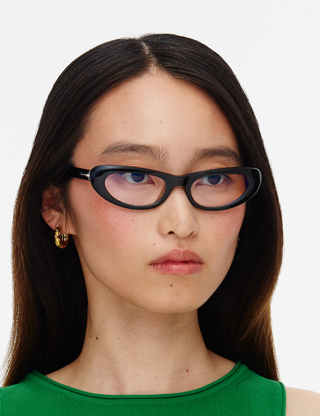 Subtly curved thin oval profile with a narrow elongated cat eye. Features ultra comfort deep-set moulded nose bridge, counter weighted temple ear-tips and smooth bevelled frame edges. Complete with Hot Futures silver bar branding on the temples and statement Hot Futures flame ear tip logo.