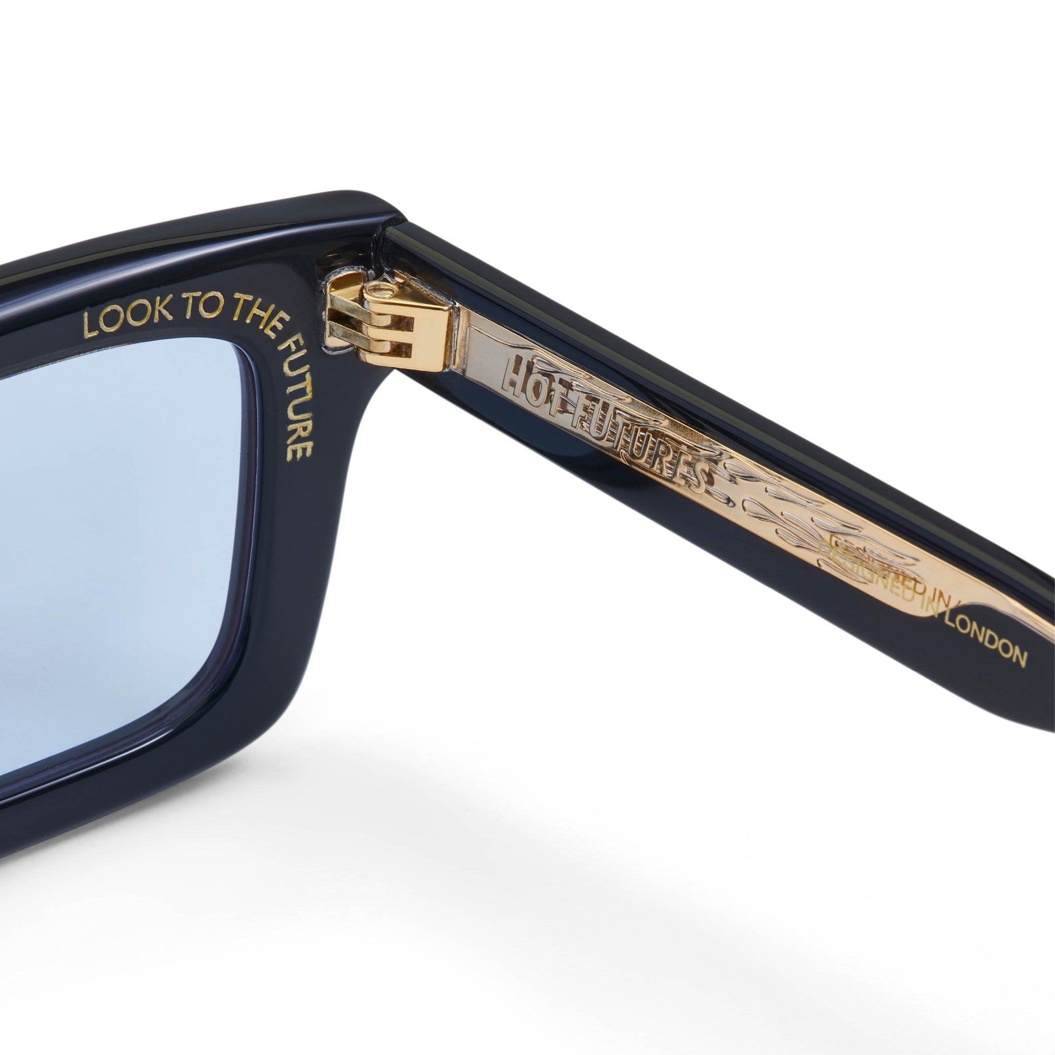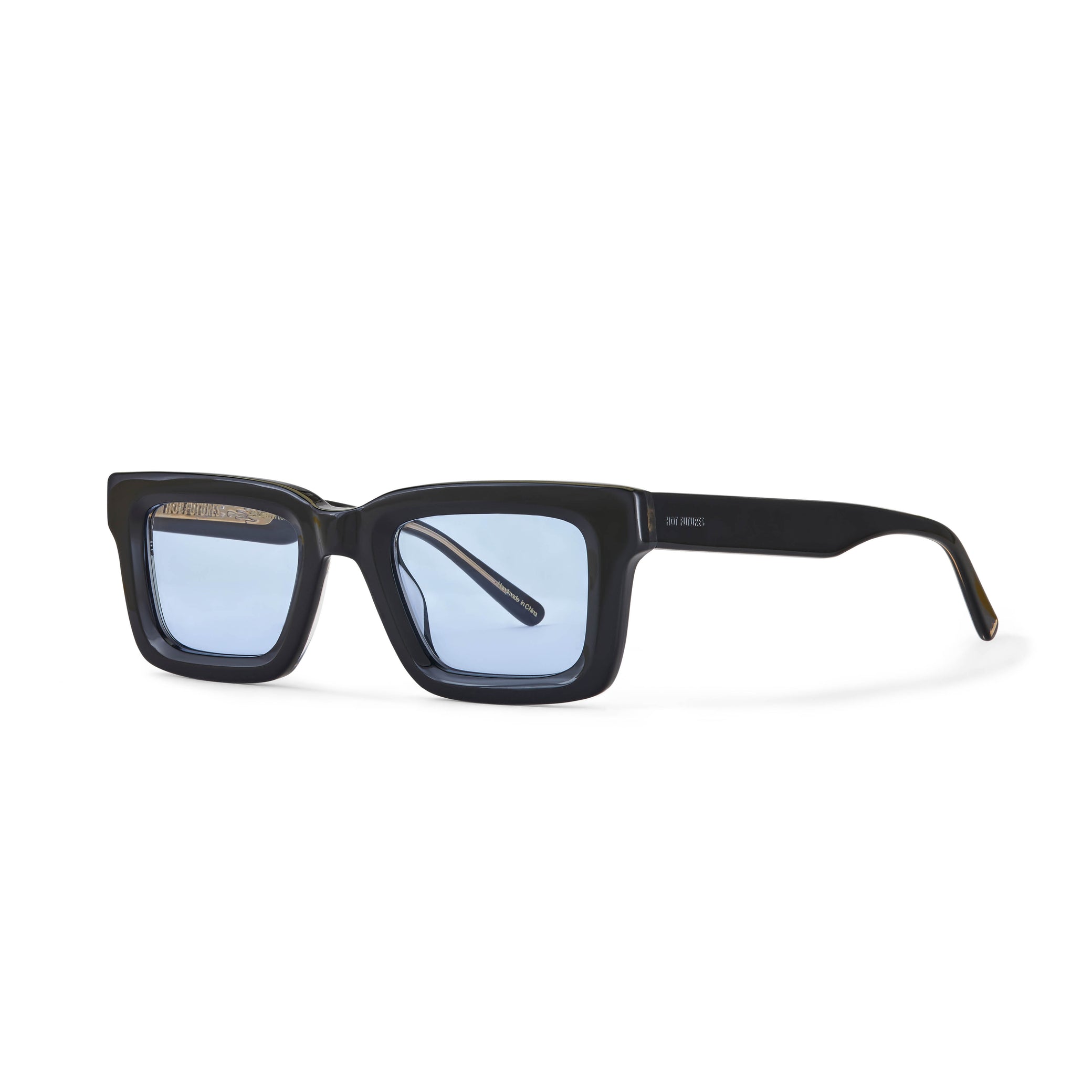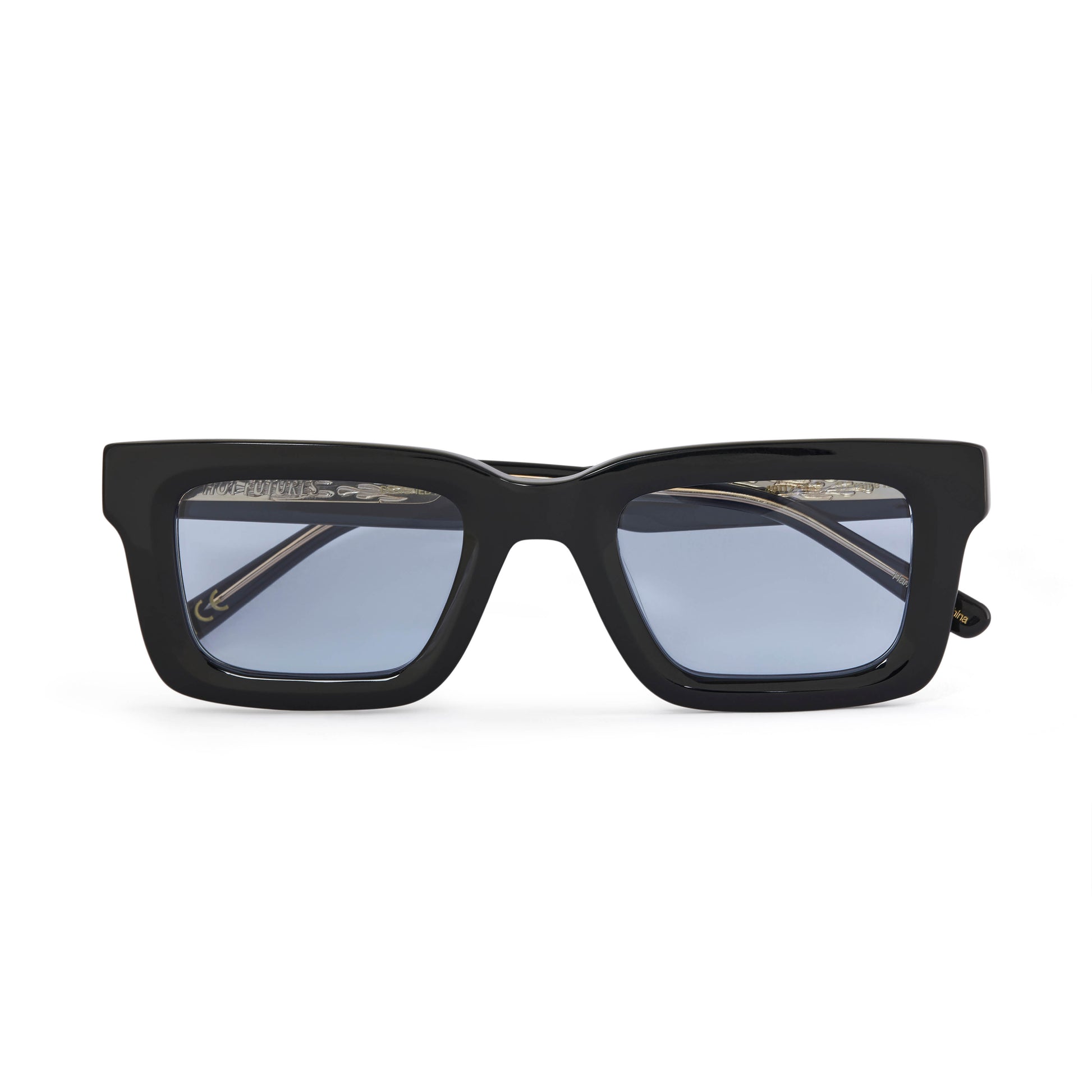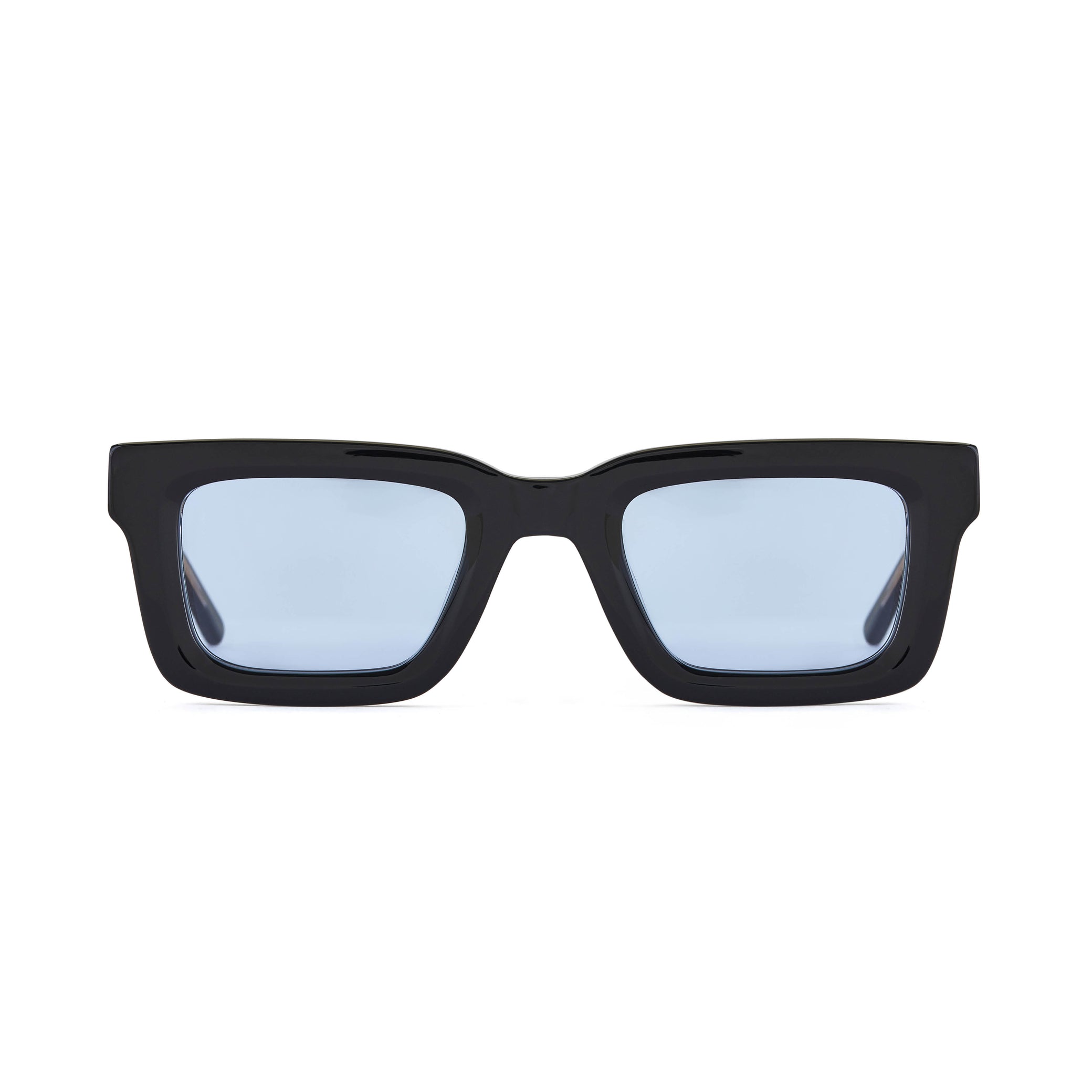 Recycled black acetate frame (Global Recycled Standard). Blue tinted 100% UVA/UVB protected CR39 Category 1 lenses. Five barrel alloy hinges. Frame width (edge to edge):144.6mm // Temple Length: 145mm // Lens width: 47.5mm // Lens height: 32mm