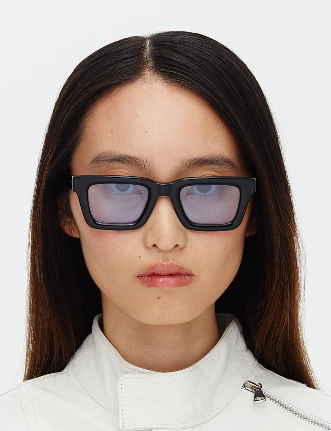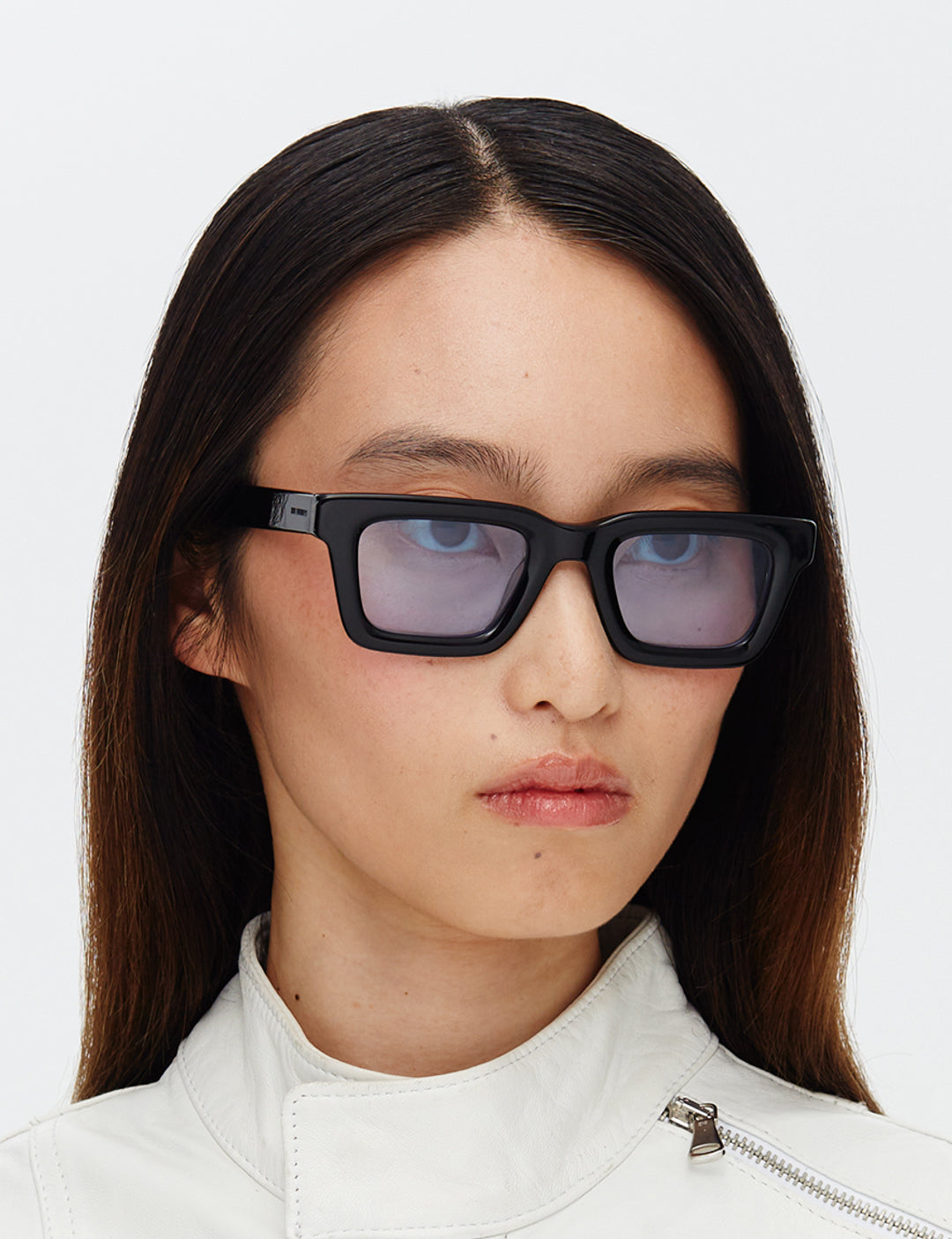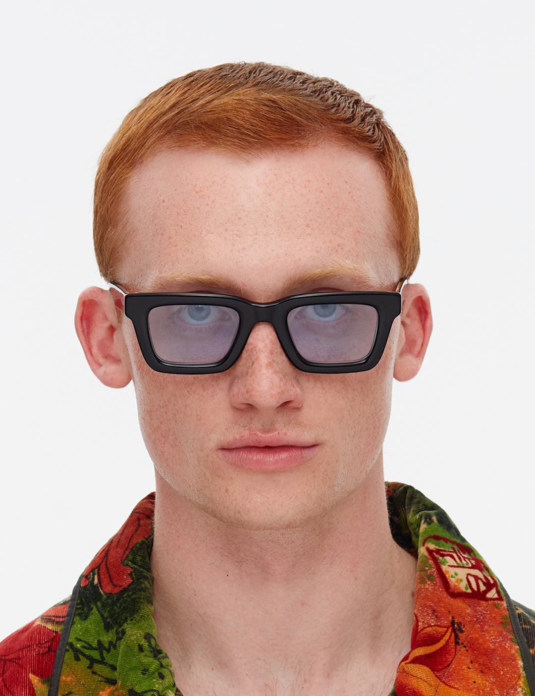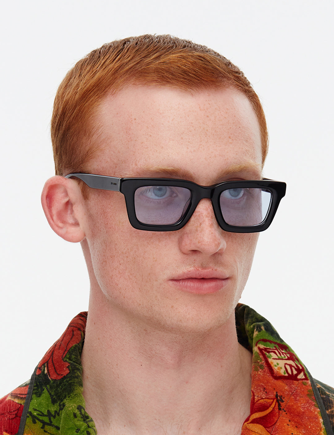 Recycled black acetate frame (Global Recycled Standard). Blue tinted 100% UVA/UVB protected CR39 Category 1 lenses. Five barrel alloy hinges. Frame width (edge to edge):144.6mm // Temple Length: 145mm // Lens width: 47.5mm // Lens height: 32mm