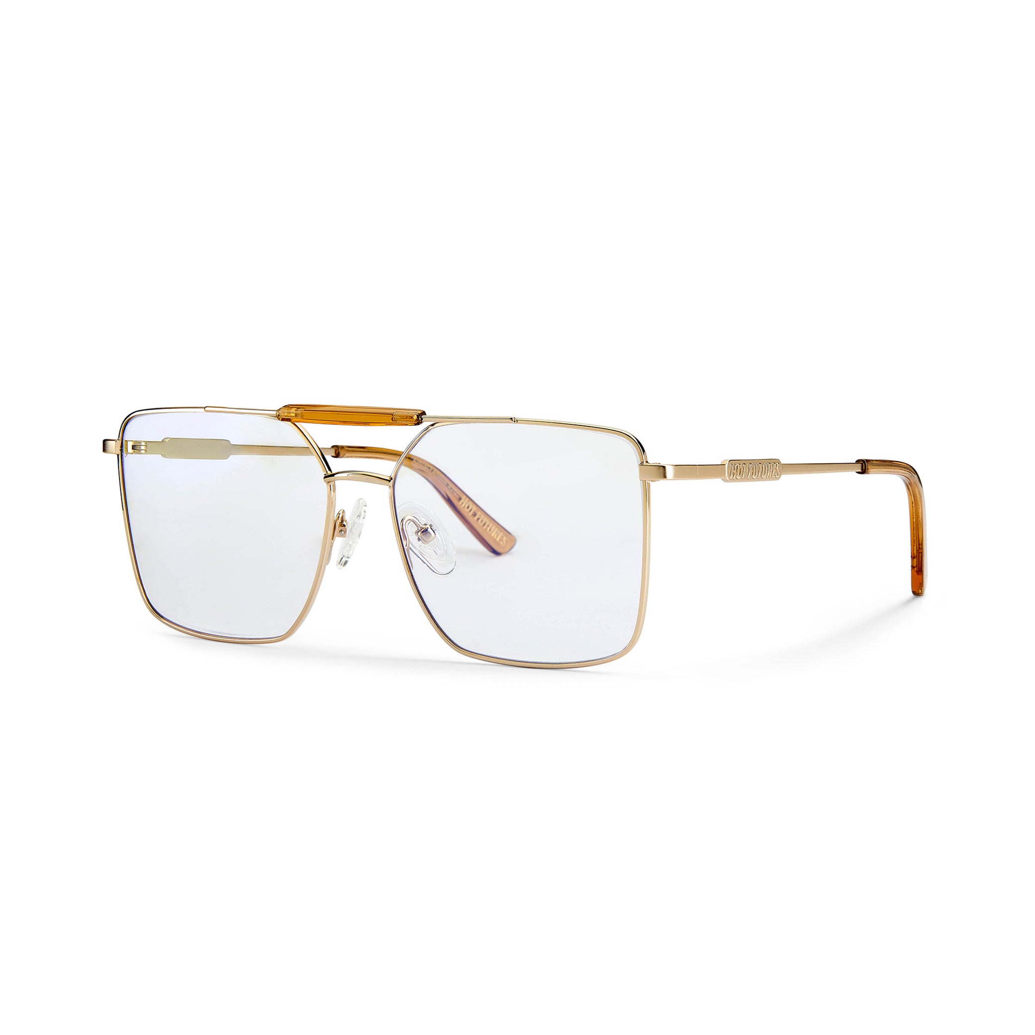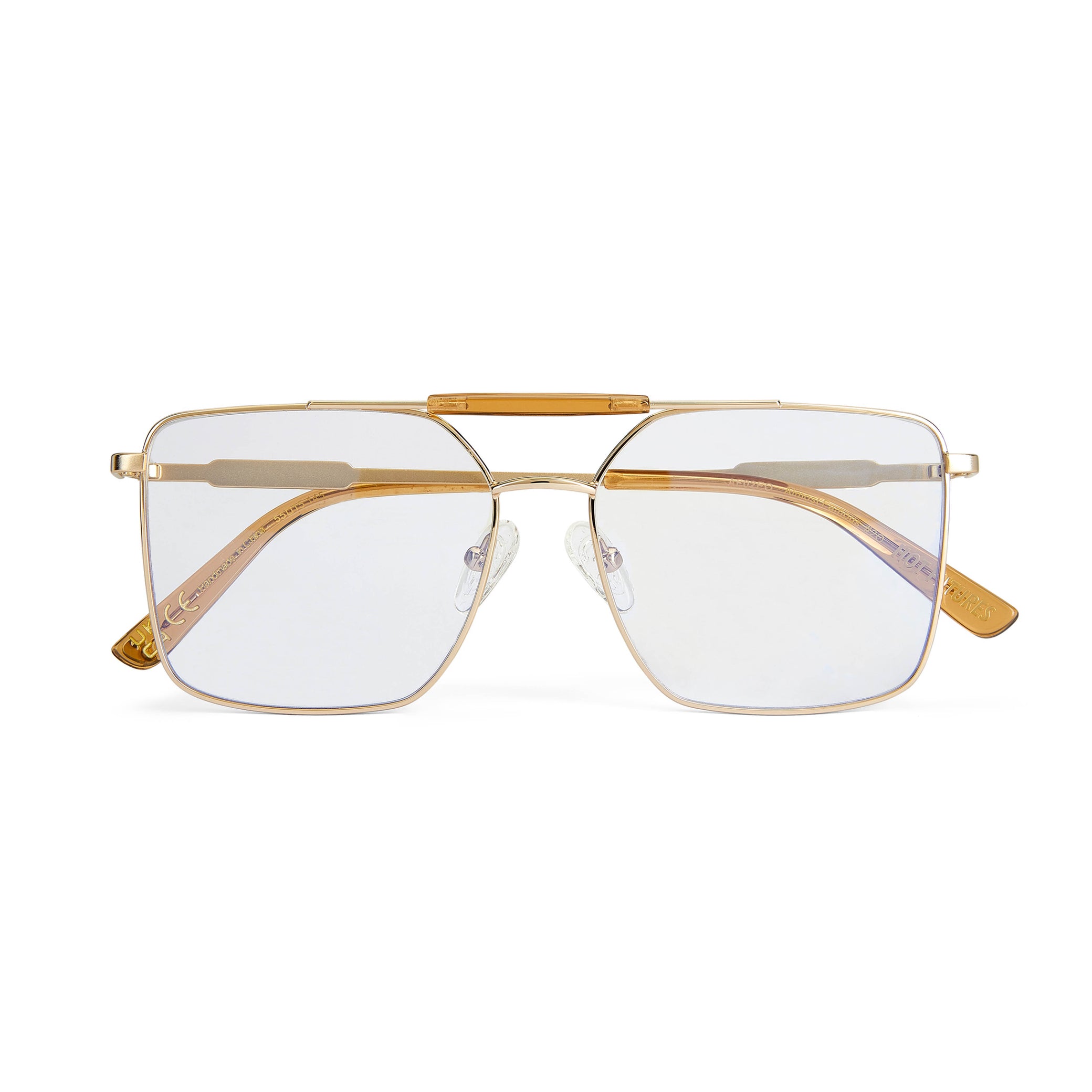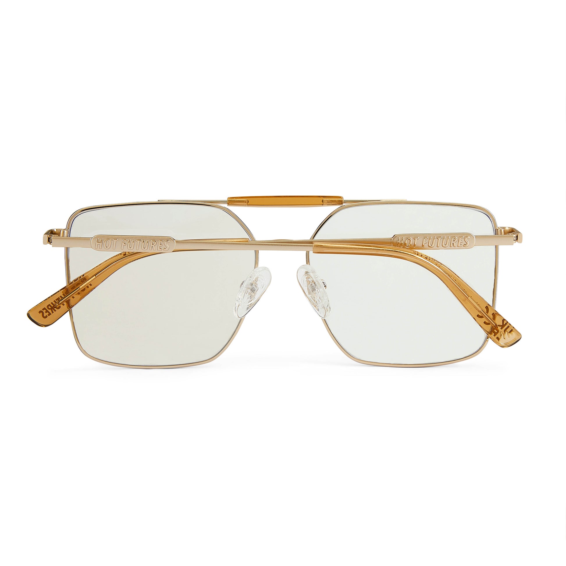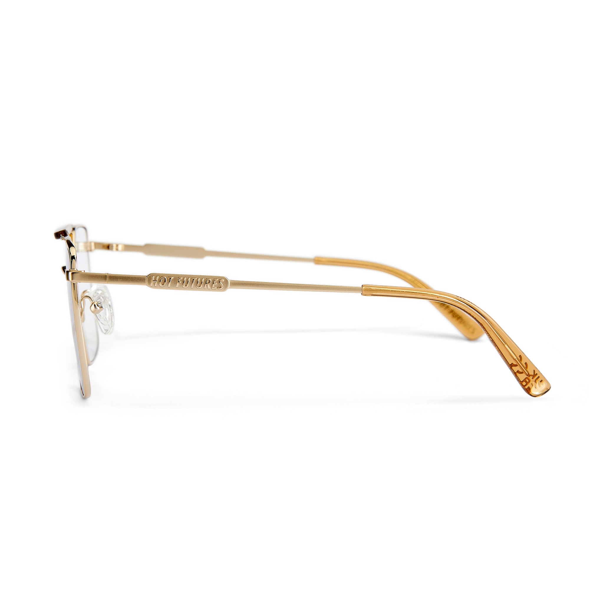 Gold alloy metal frame. Three barrel alloy hinges. Frame width (edge to edge): 135mm // Temple Length: 145mm // Lens width: 54mm // Lens height: 47mm.