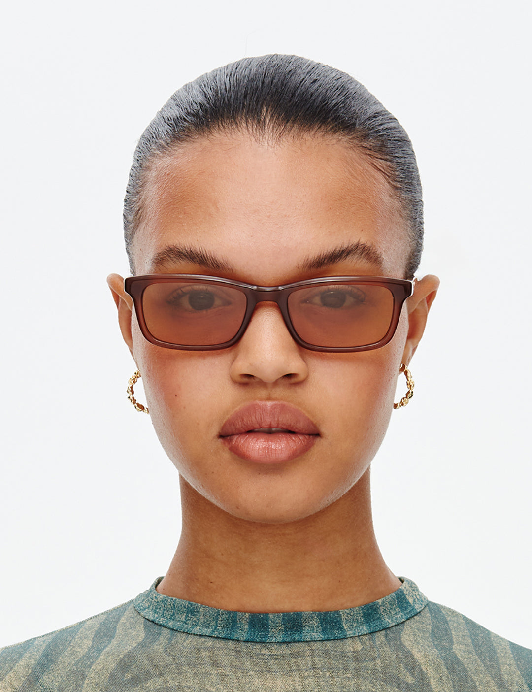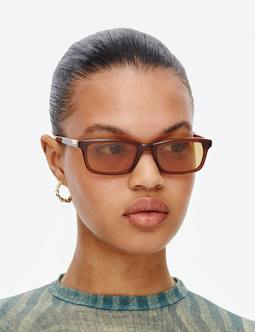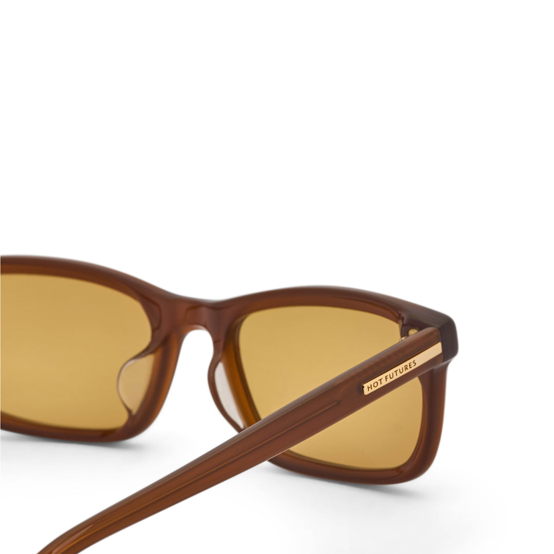 Brown acetate frame. O.G Gold 100% UVA/UVB protected CR39 Category 2 lenses. Integrated alloy hinges. Integrated alloy hinges. Frame width (edge to edge): 140mm // Temple Length: 150mm // Lens width: 53mm // Lens height: 31mm.