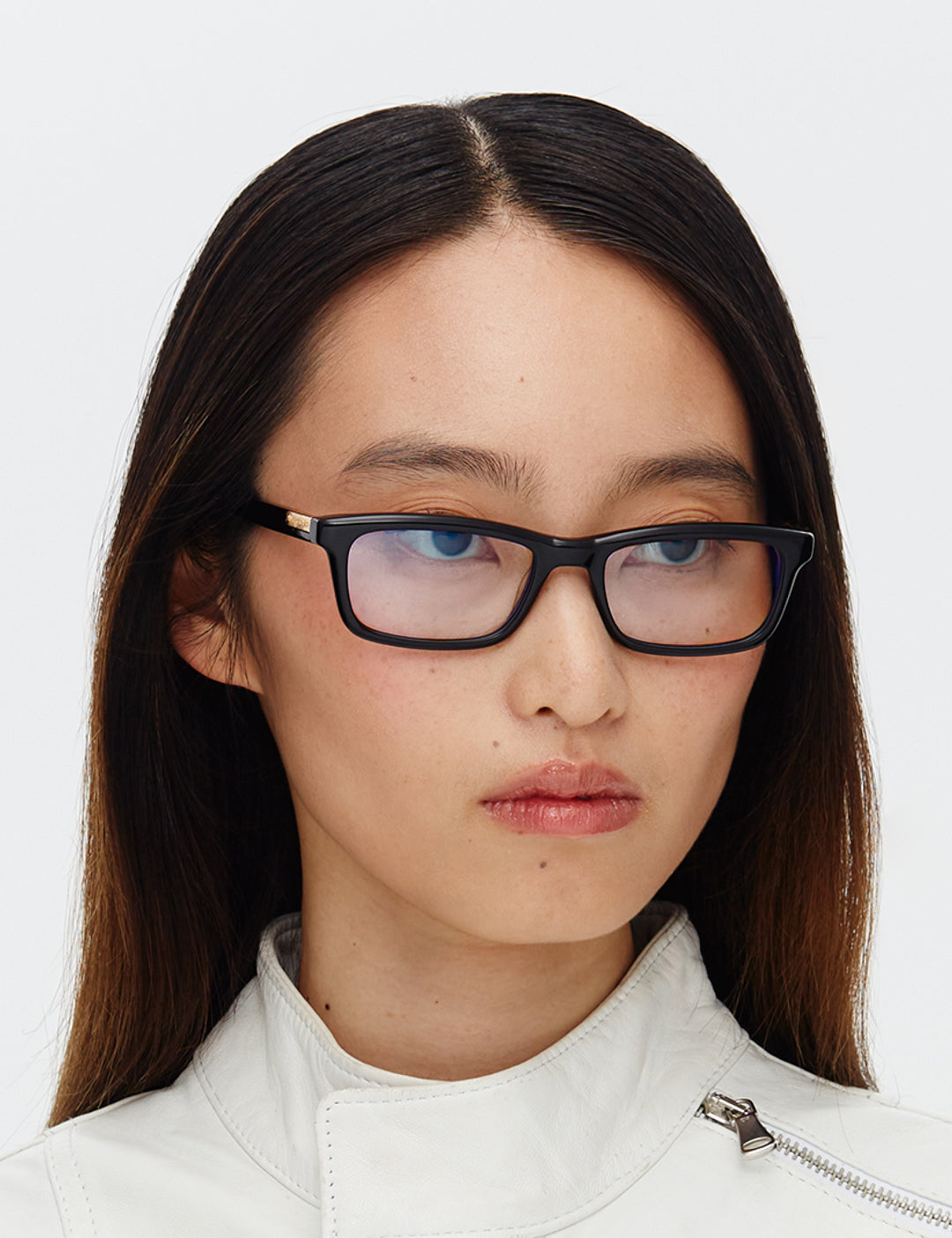 Recycled black acetate frame (Global Recycled Standard). Integrated alloy hinges. Frame width (edge to edge): 140mm // Temple Length: 150mm // Lens width: 53mm // Lens height: 31mm.