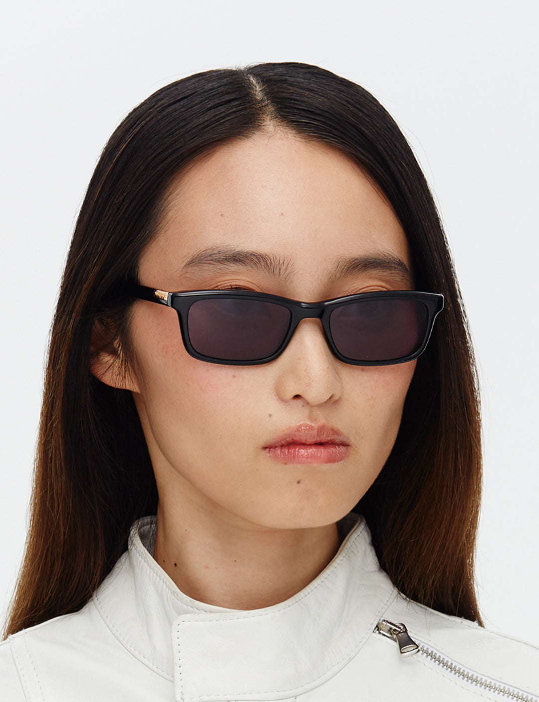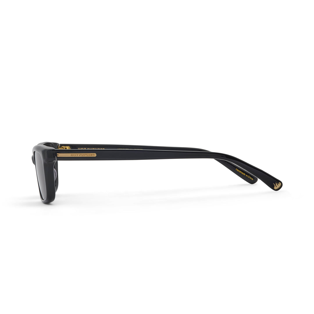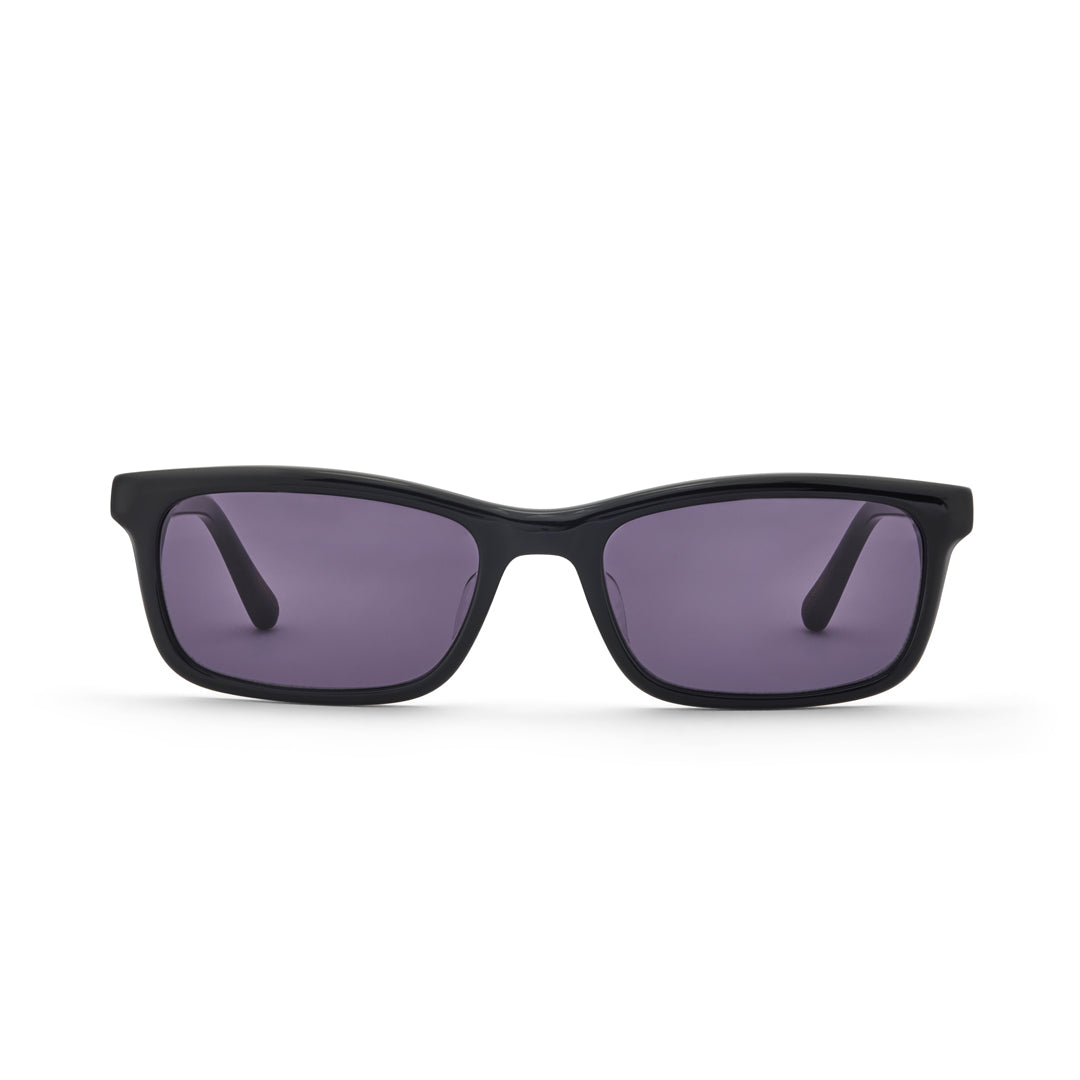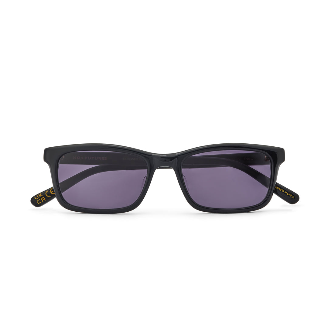 Recycled black acetate frame (Global Recycled Standard). Smoke 100% UVA/UVB protected CR39 Category 3 lenses. Integrated alloy hinges. Frame width (edge to edge): 140mm // Temple Length: 150mm // Lens width: 53mm // Lens height: 31mm.